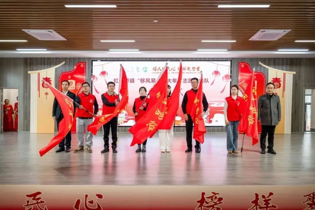 “长兴好人”发布仪式结束后,县委宣传部副部长、县文明办主任蔡良琪和虹星桥镇人民政府党委书记卢志刚为宋高村、谭家村、港口村、白水村、西南村、郑家村等6个村进行虹星桥镇“移风易俗过大年”志愿服务队授旗。