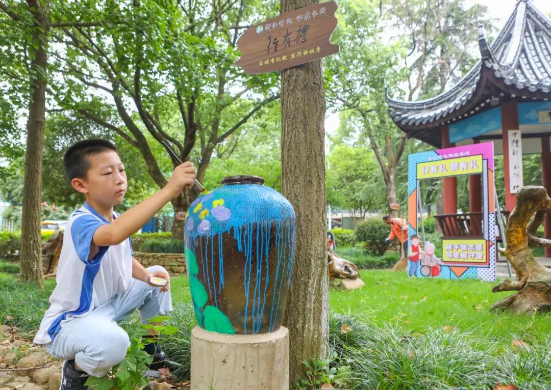 在公园的健康步道上每隔一段距离,设置融入了“浙江有礼”省域文明新实践10种礼节的其中一礼,组织志愿者用废弃瓦罐进行涂鸦,装扮点缀,同时贴上“十礼”标签,能让村民们走一步、学一礼。在公园的内侧还设置了一处十礼亭,可供村民们休闲娱乐,及组织孩子们开展各类教育宣传活动。在公园的入口处及中间还设置了打卡相框,相框同时融入十礼内容,充满趣味。