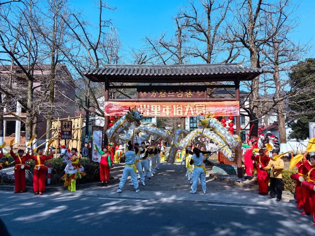 岕里年俗大赏活动在一阵欢快的锣鼓声中拉开序幕,两条“五庄白龙”闪亮登场,当地村民用舞龙祈祷来年风调雨顺,五谷丰登。紧跟着一群头扎红绸的“白马”上场,演员们身穿黄色对襟衣、灯笼裤,腰扎红色绸带,手拿红色马鞭,热情地表演,赢得了阵阵掌声。