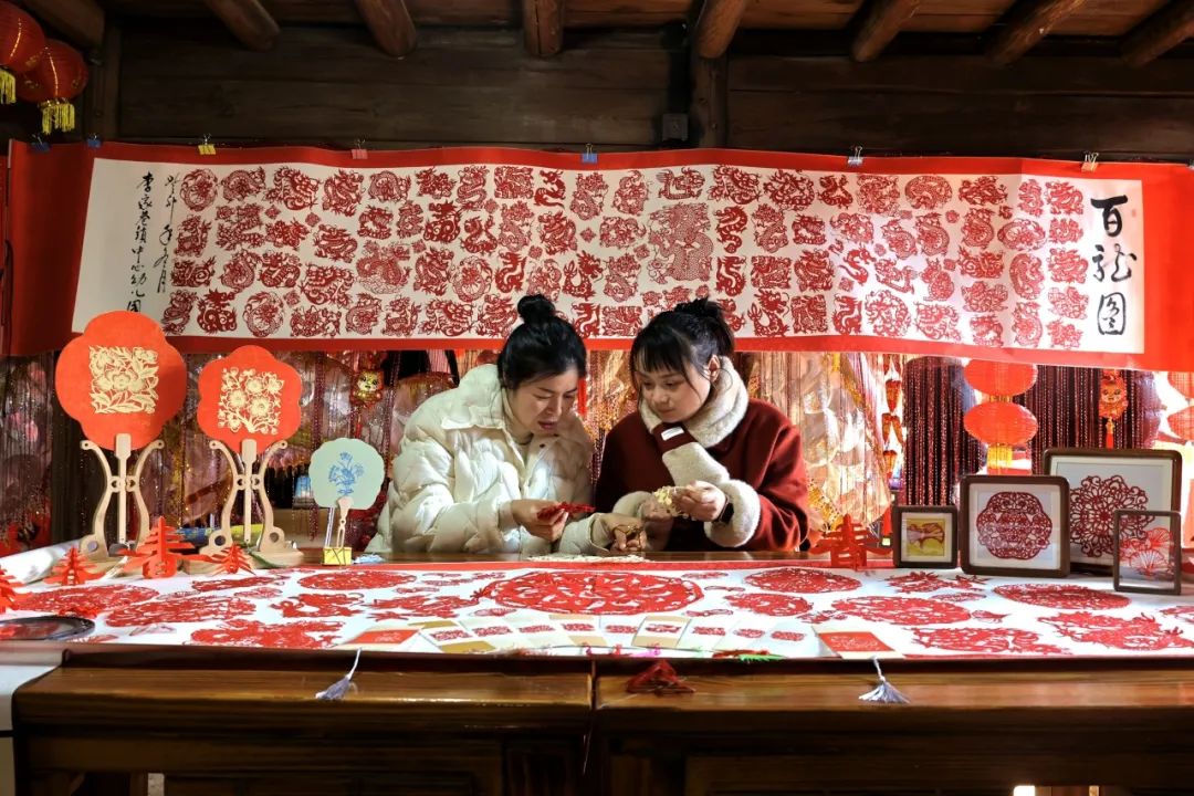 在巨幅“百龙图”背景下,两位剪纸能手灵巧地转动着剪刀,一条条活灵活现的龙、一幅幅“红梅报春”图就像变戏法一样瞬间展现在观众面前。