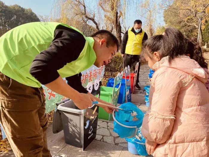 手拿垃圾夹,手提小蓝桶,尽管天气寒冷,但孩子们的热情不减,挥动着小小工具,将发现的烟头、纸巾等垃圾一一捡拾干净。为了让垃圾回到它们正确的“家”,垃圾分类志愿者指导孩子们亲手分类并归置到相应的垃圾桶内。“黑色的桶是烟头的‘家’、绿色的桶是苹果皮的‘家’.....”孩子们叽叽喳喳回答着志愿者的提问,并将垃圾扔进了正确的桶内,捡到的垃圾都得到了妥善的“安置”。