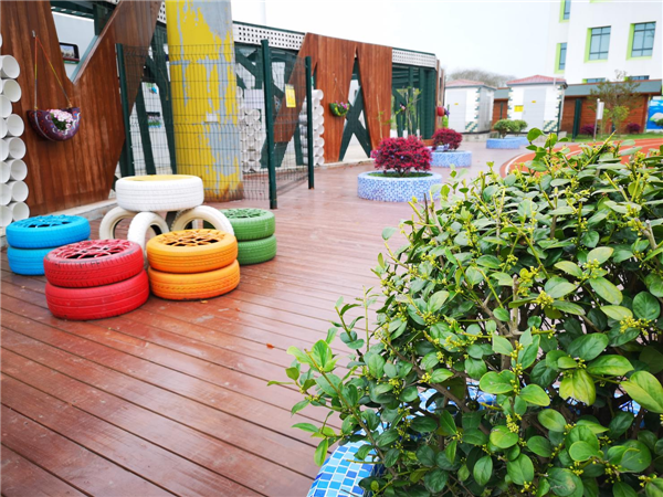 学校通过校园环境的营造,让学生身处绿色氛围,在日常生活中自然习得垃圾分类知识。教学楼三楼的环保知识长廊,呈现垃圾分类专题知识、图片、学生作品,时刻提醒学生要有垃圾分类的意识;位于学校北侧围墙的 “向绿而行”环保长廊,将历年来的环保活动以时间轴的形式图文并茂展出;“手拉手地球村”回收小木屋内设置“垃圾分类心灵对对碰”留言板,为学生们交流分享自己的收获、感悟提供平台。