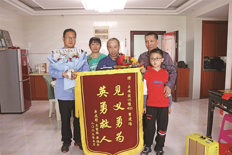 “救命之恩,我们全家会记一辈子!”昨天下午,新市民牟先生一家三口专程来到南丰镇永合社区永瑞园,将一面写有“见义勇为 英勇救人”的锦旗送到“救人爷爷”曹建培的手中,向老人表达了最诚恳的谢意。