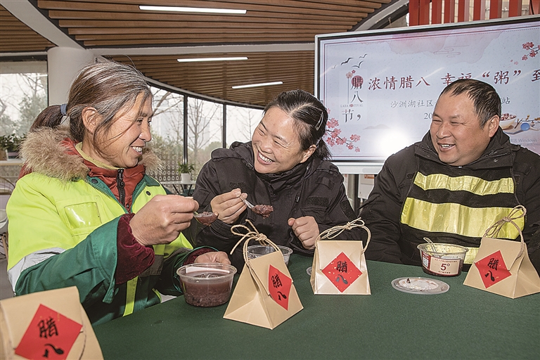 经开区(杨舍镇)沙洲湖社区邀请辖区环卫工人共同品尝腊八粥 陈佳琪 摄