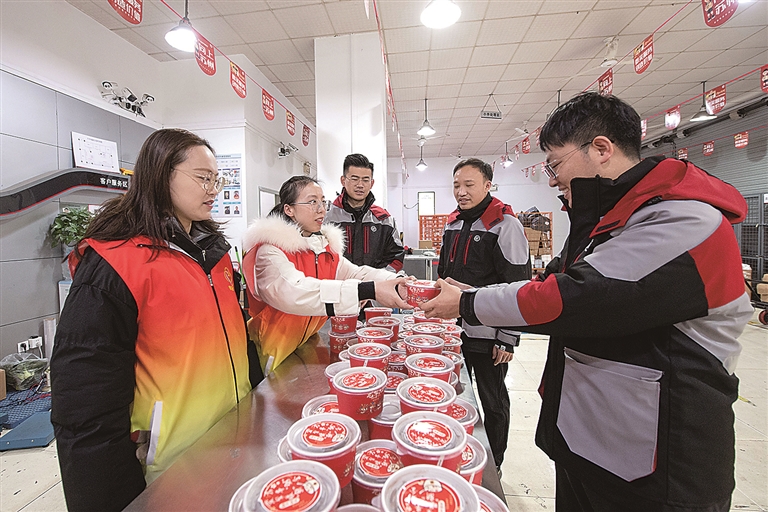 经开区(杨舍镇)勤丰社区志愿者将腊八粥送到快递员手中 任广真 摄